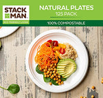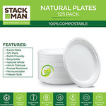 Details: 9 inch Paper Plates: Serve full meals in convenient style compostable food plates. Perfect to serve a main dish with sides. The biodegradable plates Makes a great choice for your daily meals or restaurants, food trucks, to-go orders, special events, and other types of food service environments. 100% Sugarcane Fiber: The nine inch plate is made of 100% sugarcane fiber, a sustainable, renewable, and biodegradable material. A great alternative to traditional paper or plastic, The disposable plate offers the same sturdy function and easy cleanup, yet It s completely Tree- and plastic-free. 100% Compostable: Since it's made from 100% sugarcane fiber, The plate can be commercially composted (no need to send it to a landfill). The plate offers a disposable design that will degrade quickly, which means convenient cleanup for you, your customers, and the planet. This Product meets ASTM D6400 or D6868 and is intended to be composted in a municipal or commercial facility operated in accordance with best composting management practices. Hot or Cold use: These plates can be used for hot or cold food items. It offers reliable strength and does not contain any plastic or wax lining. Microwave-safe: The plates are microwavable & freezable. Oil and cut-resistant. Note: Hot foods can cause the plates to perspire and condensation to form at the bottom. Perfect for any occasion: With a wide range of products and a classic design, Stack Man provides premium products and Peace of mind that you are providing all-natural organic tableware for your family and friends. Perfect for camping, picnics, lunches, catering, BBQs, events, parties, weddings and restaurants.