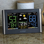 Details: La Crosse Technology introduces the Wireless Color Weather Station with precise, real-time backyard weather. Full-color display gives you dynamic weather forecasting adjusted to the barometric pressure. Indoor comfort indicator can help achieve a comfortable and healthy living environment and may even save you heating costs. Monitor your current backyard temperature and humidity at a glance with the included transmitting outdoor sensor and historical records of the daily highs and lows. Keep on time with its accurate self-setting time and date and automatic resets for Daylight Savings Time. Includes power adapter for full intensity controls and constant backlight display or operate by batteries (sold separately) for on-demand backlight feature to save battery life. Keep up to date with your own home’s personal meteorologist! Your weather, today!