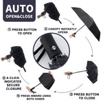 • FULLY AUTOMATIC UMBRELLA : Auto open and close umbrella can handy for quick entry into a car, building or tent. You can quickly open or close the travel umbrella at the press of a button