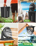 • ⭐【Hanging Fan & Floor Fan】- The base of the fan has a hook design, not only can you use it on the desktop or floor, but you can also hang it on trees, horizontal bars, tents, and other occasions expediently. (when used hanging, the mist function cannot be used.)