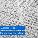 - 【Commercia and Residential Use】Outdoor flooring commercia use: use these drainage tiles for fitness room, swimming pool, locker-room, hot spring bathing pool, sauna/SPAS room, hotels, as well use in sports facilities or flooring in boats, and so on; Residential use: install in bathroom, kicthen, garage, pet area, vehicles and campers, near the door for wet boots/shoes, plant pot and so on