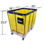 Details: This Higood 12-Bushel Vinyl Basket Truck is ideal for moving goods around a warehouse. It has a 600-lb. capacity and rolls smoothly on 4in. polyurethane swivel casters. A removable super-strong vinyl fabric liner allows for easy maintenance. Liner is laced to frame with nylon rope through a row of rust-resistant grommets in a reinforced hem. Basket is 40in.L x 28in.W x 30in.D. Steel and hardwood frames deliver the durability you expect from an industrial basket truck. Assembly required. Total Capacity lbs. 600, Wheel Size in. 4, Color blue, Dimensions36"L X 26"W X 34"H, Material Type Steel, hardwood, vinyl, Wheel Type Swivel caster. Ideal for moving goods around a warehouse 12-bushel, 600-lb. capacity Rolls smoothly on 4in. polyurethane swivel casters Removable vinyl fabric liner allows for easy maintenance Steel and hardwood frames for industrial strength.