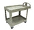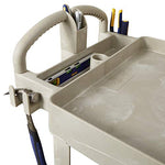 Details: The Rubbermaid Commercial Products 2-Shelf Utility/Service Cart is constructed of sturdy structural foam that will not dent, chip, or peel. 2 shelves support up to 500 lbs. of materials throughout the facility use space. Rounded corners protect walls and furniture. This rolling cart has 5" non-marking swivel casters for lightweight maneuverability. With handle compartments for additional storage, molded fittings for rolled supplies, an easy-access lipped bottom shelf, and a lipped top shelf, this is a versatile and indispensable utility cart for any facility. Availible with lipped shelves for secure storage, or flat shelves for oversized loads.