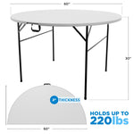 • USE IT FOR PARTIES & DINNERS... then fold this plastic table up and take it anywhere you need extra seating, additional serving space, or tabletop display ability! 60-inch round table is great for holiday dinners, parties, picnics, BBQs, backyard events, camping, pop-ups, craft fairs, and more.