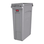 Details: The Rubbermaid Commercial Products vented slim jim trash can, waste receptacle is crafted to make waste management compliance easier and reduce strain on workers. Constructed of high quality, commercial-grade materials, these trash cans feature 4 venting channels that make removing garbage bags up to 80% easier than traditional straight wall receptacles. By allowing air to flow into the can, liners can be pulled more easily from the garbage can which reduces strain on staff and increases efficiency. 4 bag cinches around the rib-strengthened reinforced rim create quick, knot-free liner changes. Sturdy handles and molded base grips make transporting and emptying contents more ergonomical while the step design prevents jamming when containers are nested. The Vented Slim Jim waste receptacle is designed for superior durability and maximum efficiency.