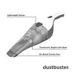 Details: Description For quick and easy cleaning, look to the BLACK+DECKER dustbuster QuickClean cordless handheld vacuum. This hand vacuum is lightweight, portable, and ready to pick up small and large debris like dust, flour, coffee, cereal, and more thanks to its powerful suction. The built-in crevice tool gives you instant access to cramped spaces and tight corners, while the translucent dirt bowl lets you see the debris level, so you’ll always know when to empty it. Plus, this hand vacuum includes a convenient wall mount that doubles as a charger, so it’ll be ready for next time.