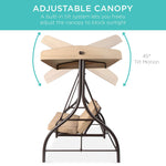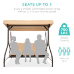 Details: Best Choice Products presents this brand new 3 Cushion Canopy Swing. This canopy swing seats up to three people comfortably. This item is low-maintenance, easy to assemble, and the fabric is weather- and stain-resistant. This canopy is the perfect summer accessory to escape the heat and relax. Our swing will look great in a backyard or front porch. It will definitely bring you much needed relaxation on those hot summer days. SPECIFICATIONS: Overall Dimensions: 73”(L) ×44”(W) ×68”(H); Seat Dimensions: 58”(L) ×21”(W) ×21”(H); Product Weight: 82 lbs.; Weight Capacity: 750 lbs.; Occupant Capacity: 3 people; Color: Tan; Material: Steel, Polyester; Assembly required (with instructions);