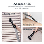 - Multiple accessories included: A quick-release handle is connected to the stretch hose for above-floor cleaning. A 7-inch-long crevice tool, dusting brush, and upholstery tool help clean hard-to-reach areas. Extract dirt, and pet hair, and freshen up your car, curtains, ceilings, or door frames. For your convenience, they are all stored right on board.