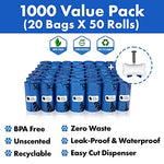 Details: Coreless bags, does not leave any waste. 1000 bags, 20 of 50 rolls, 1 patented dispenser inside. Color: Blue, Standard 9" x 12" size , built strong EPI plastic, leak proof