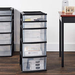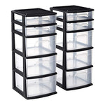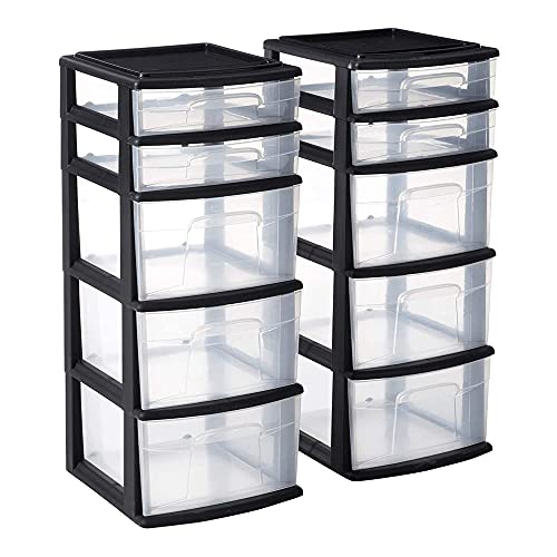 Details: Stay better organized and limit clutter with the help of this set of two 5-drawer plastic storage towers. It is ideally suited for home, office, dorm room, or nursery. Clear drawers allow contents to be identified with ease. The cabinet’s top features a sizable recessed compartment for quick access to pens, stapler, stationary, and so much more.