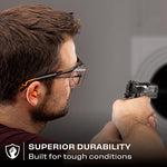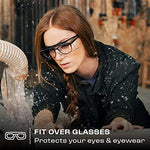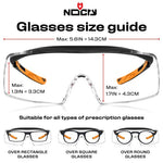Details: Technical specs Material: Latex free polycarbonate Lenses: Clear, with scratch resistant coating UV protection: 400nm (nanometers) PPE field of view: >40° Max temple arm length: 5” Max nose bridge diameter: 1” Total frame width across the front: 5.7” Max frame height: 1.77” in the center Weight: 0.083lbs Since these glasses are clear, how do they keep your eyes safe from UV light? The 400nm UV protective lens coating is the highest industry standard in clear PPE eyewear lenses. Shield your eyes from not only 90-100% of harmful UVA and UVB radiation rays, but also UV light emitted by artificial light sources. Safeguard this coating by cleaning the lenses with a microfiber cloth, and store in the NoCry protective case (sold separately). Avoid using rough cloths or household glass cleaner. How to reduce the chances of scratching your prescription glasses? Ensure no part of your eyewear lenses are in direct contact with the OTG glasses. There should be a gap between the lenses of your own glasses and the lenses of the OTG glasses. If you have thin frames, fully extend the adjustable arms of the over-spec glasses. The tops of the frames of the OTG’s should be directly on top of and over the frames of your glasses - both pairs should feel secure and snug. Are they comfortable enough to wear all day? According to hundreds of customer reviews, these safety glasses are so comfortable you'll forget you're even wearing them. The unobstructive lightweight construction and the soft rubber nose piece mean they sit lightly on your face. They won't feel bulky or awkward even after hours and hours of work.