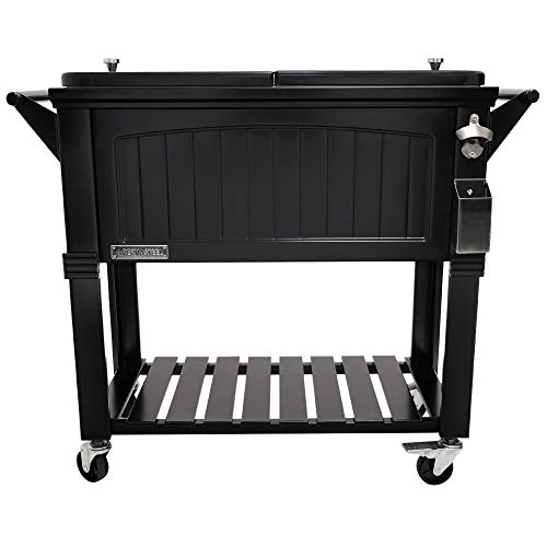 Details: Description Are you ready to throw the best outdoor party ever? Let the Permasteel 80-Qt Antique Style Outdoor Patio Cooler be a part of it! This beautiful powder-coated steel rolling cooler cart with injected molded insulation technology will make sure your beverages stay cold for up to 36 hours. With 110 – 12oz cans capacity, this wooden teak-style patio cooler has plenty of room for all your refreshing drinks and ice. And that's not all - it also comes with a convenient bottle opener and cap catcher. No more rummaging for the bottle opener! And you don't need to worry about it staying in one place - with its four heavy-duty casters--two locking for stability--you can easily roll this patio cooler wherever the party is going. So, get ready to entertain your guests in style - only with the Permasteel 80-Qt Antique Style Outdoor Patio Cooler! Fully removable split hinge lid – quickly access ice-cold drinks Integrated bottle opener & catcher – open beer or soda bottles without having to search for a separate bottle opener Drinks stay cold for up to 36 hours when used with ice packs Easy to clean & use – wipe down the outdoor cooler and use the included drain plug Wheeled cooler for easy portability – moves your outdoor cooler around with the 4 casters (2 locking casters) Bottom shelf for extra storage Outdoor patio cooler with wheels available in the following color options: Black, Cream White, Red, Sage Green, and Teal Blue-Green Protect your patio cooler with the Permasteel patio cooler cover (ASIN: B07JN2M4DM)
