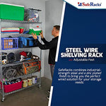 Details: SafeRacks Wire Shelving Storage Unit. Clean up your home or garage and get organized. This wire shelving measures at 18" x 48" x 72" giving any homeowner ample space to store and organize their tools, storage bins, sports equipment, and home goods. Constructed from high strength steel with industrial-strength zinc coating, these shelves can hold up to 500lbs. 3" wheels allow the unit to be easily moved even when fully loaded. Shelves can be adjusted in 1" increments or removed entirely to allow space for larger items.