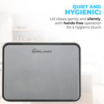 - Quiet-Close Lid: Lid closes quietly and gently without slamming. Hands Free and Fingerprint Proof: Hands-free operation with durable a metal foot pedal and fingerprint-resistant stainless steel finish leads to your trash can staying cleaner longer