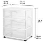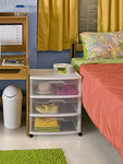 Details: Description The Sterilite 3 Drawer Wide Cart offers a practical and versatile storage solution for any room of the home! Organize a variety of household items where they are most frequently used - in the bedroom, kitchen / pantry, bathroom, craft room, nursery or dorm room. It can even double as a nightstand, dresser or way to make efficient use of closet space. Neatly store anything from clothing, accessories, and towels to craft supplies, health and beauty items, toys, and more. The drawer design features an integrated handle for easy opening and is clear, allowing contents to be easily identified, while keeping them contained. The drawer stop feature prevents drawers from being removed accidentally. Add the casters to create a rolling storage option, and easily move the Drawer Cart wherever it is needed. It's easy to get organized and keep your living spaces clutter-free with the 3 Drawer Wide Cart!
