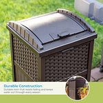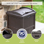 Details: Description Keep unsightly garbage out of view with the Suncast 33 Gallon Resin Outdoor Hideaway Patio Trash Can. This patio trash can features a decorative wicker-style design for a stylish addition to your outdoor space. The decorative and functional waste bin is compatible with standard 30 gal. garbage bags for easy and convenient use. This trash can also features a secure latching design to help keep trash in and critters out. Constructed from durable resin that resists fading, this trash can is built to bring provide long-lasting use on your porch or patio. The Suncast 30 Gallon Resin Outdoor Hideaway Patio Trash Can measures 16" x 15.75" x 31.7" to keep your porch clean without taking up too much space. Suncast takes pride in helping customers enhance their indoor and outdoor spaces with quality products that are stylishly designed. You take pride in creating a beautiful environment. We take pride in keeping it that way.