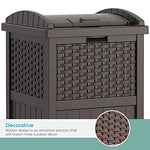 Brand: SuncastColor: BrownFeatures: OUTDOOR PATIO TRASH CAN: Features a decorative wicker-style design for a stylish addition to your outdoor space FUNCTIONAL DESIGN: Lid is hinged for easy access and latches...