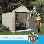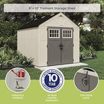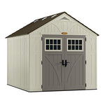 Details: Storage space can be a problem, let the Suncast Tremont Resin Storage Shed be your solution. This large sized 8 ft. x 10 ft. shed offers a spacious capacity of 574 cu. ft. and wide double doors with windows, allowing you to move and store oversized items with ease. The outdoor storage shed is constructed of blow molded resin that is both durable and strong. Resin is easy to clean and will not rust or rot, for an attractive and professional-looking space that will last a lifetime. The roof is engineered from hardened weatherproof plastic and reinforced with a metal truss system built to battle the elements. With 2 windows and 6 skylights, your shed is easily navigated in the daytime with natural light. Also included are 2 corner shelves to optimize storage space and keep your tools organized.
