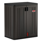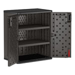Details: The Suncast Commercial 9 Cubic Ft. Heavy-Duty Resin Cabinet is a practical and robust storage solution for any garage, workshop, or professional setting. Crafted from durable multi-wall resin panels, this outdoor weatherproof storage cabinet is engineered for maximum strength, providing resilience against rust, warping, and dents while offering long-lasting use in demanding environments. The two metal-reinforced adjustable shelves are designed to hold up to 200 lbs. each, making them perfect for heavy tools, equipment, and supplies. With padlock-compatible built-in handles, this cabinet ensures your stored items remain secure and protected. Its sleek, compact design measures 36" H x 30" W x 20.25" D, offering ample storage while conserving valuable space. Whether for organizing tools, cleaning supplies, or professional materials, this heavy-duty cabinet delivers functionality, durability, and a modern aesthetic to elevate any workspace.